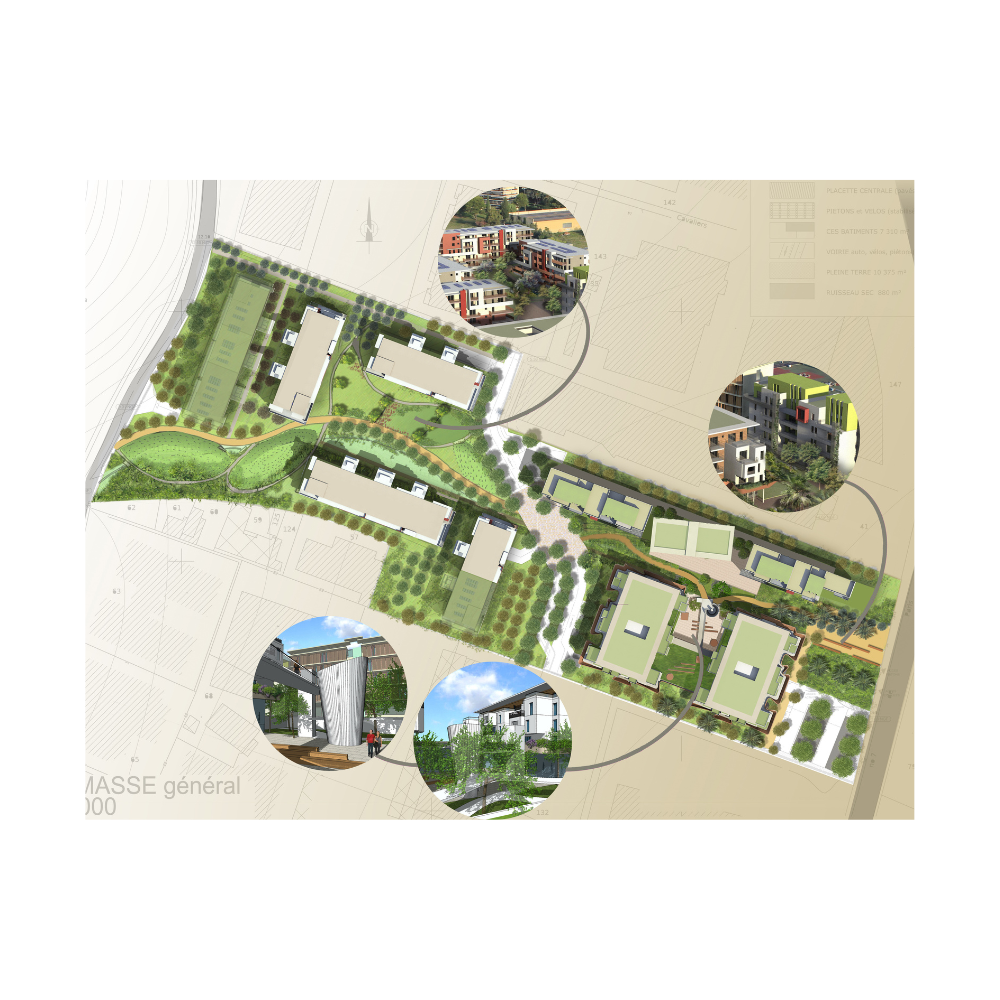 Sur un vaste terrain d’environ un hectare, le plan masse propose l’implantation de dix bâtiments, orientés selon des axes est-ouest ou nord-sud, afin d’optimiser l’ensoleillement et la ventilation naturelle. Conçu selon le principe d’un éco-îlot (90 m x 300 m), le projet prévoit de regrouper l’ensemble des stationnements en sous-sol, libérant ainsi la surface au profit d’espaces verts et de cheminements doux. Les voies situées à l’intérieur de la parcelle sont réduites à des voies de service et de sécurité, contribuant à la quiétude et à la qualité environnementale du site.