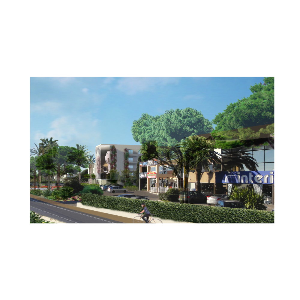L’agence Épure a travaillé sur les trois bâtiments situés au Sud-Est. Ces volumes, d’une largeur de 13 mètres, s’effilent progressivement le long de la RN7 pour former une lame de 7,20 mètres d’épaisseur tournée vers la mer. Le bâtiment central, destiné à accueillir une cité universitaire, se distingue par son expression architecturale propre. Le choix des matériaux y affirme sa différence : une façade animée par des panneaux pivotants crée une double peau fonctionnelle