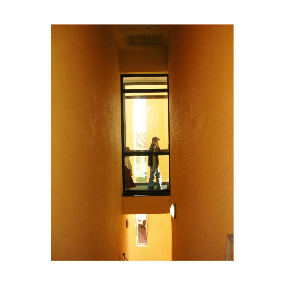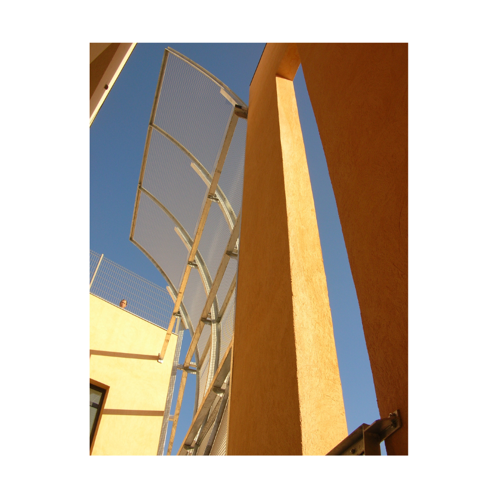 Le nouveau bâtiment s’organise sur deux niveaux, surmontés d’une cour de récréation avec une toiture, ouverte sur l’horizon. Cette disposition permet de libérer l’espace au sol tout en maintenant un lien fort avec le paysage environnant. Le bâtiment, mono-orienté, est conçu autour d’un patio central et d’un escalier qui assure la connexion entre l’ancienne école et la nouvelle extension, favorisant ainsi une circulation fluide et intuitive.