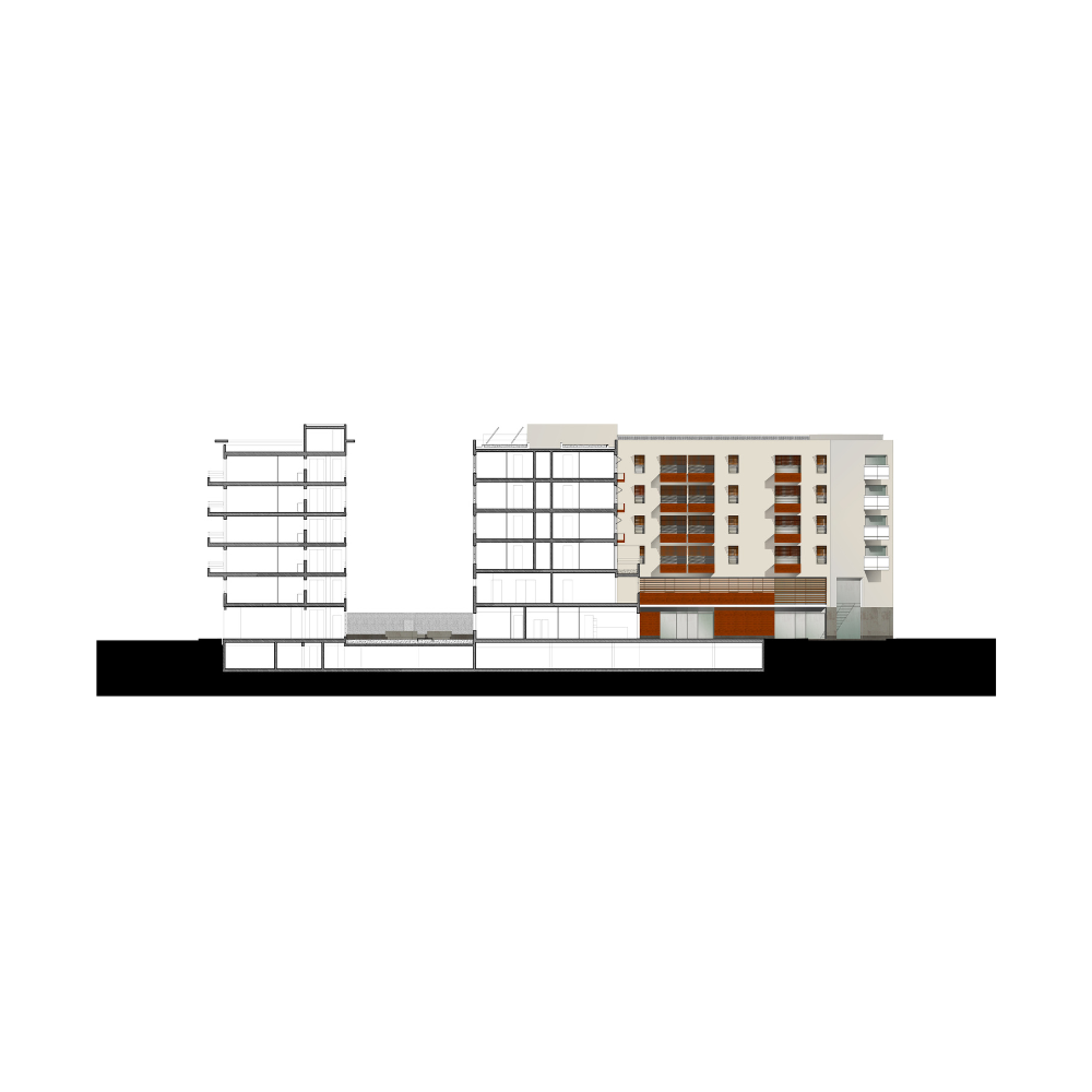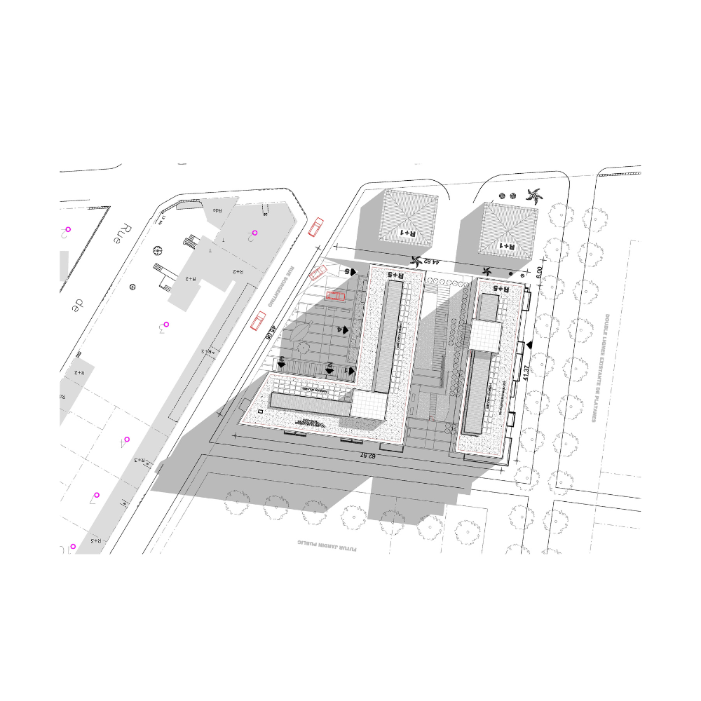 Le projet reprend l’implantation initiale préconisé par les urbanistes de la ville, qui structure l’ilot en dégageant une lignée végétale Nord Sud au coeur du projet et une place minérale à l’Est, rue Sorgentino.