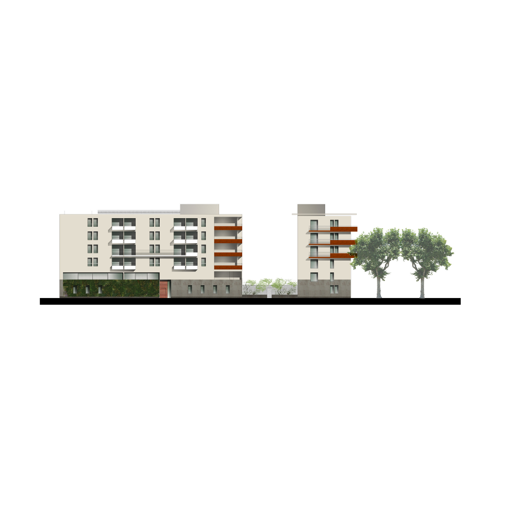 Afin d’élargir l’angle de la perspective végétale, les logements sont distribués par une coursive exterieur ouverte à l’Est. Cette disposition privilégie l’ouverture des logements sur la façade Ouest bordée de platane centenaire. Ces arbres tempèrent l’apport d’énergie et filtrent la lumière, ils constituent un écran végétal naturel pour les logements, chaque unité d’habitation est agrémentée d’un balcon qui prolonge en extérieur les superficies des séjours et des chambres.